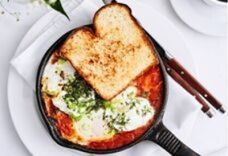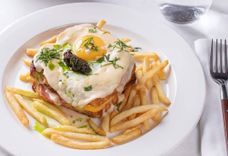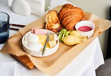600 г • Два яйца пашот в сырном соусе, авокадо, круассан, взбитое масло, салат из зелени и томатов, бри, чеддер, мортаделла, французский тост с карамелью и шантильи