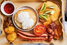690 г • Два Яйца на выбор, Два Куриных Стрипса с Кетчупом, Две Сосиски, Жареный Бекон, Грибы и Томаты, Хашбраун, Три Панкейка с Сезонными Фруктами, Медом и Сливочным Маслом.