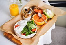 620 г • Яйцо пашот из авокадо, салат из зелени и томатов, лосось, креветки, рикотта, домашний палео-хлеб, Чиа пуддинг